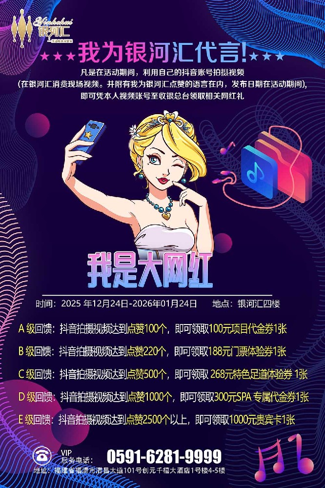 *凡是在活动期间,利用自己的抖音账号拍摄视频(在银河汇消费现场视频。并附有我为银河汇点赞的语言在内,发布日期在活动期间),即可凭本人视频账号至收银总台领取相关网红礼。