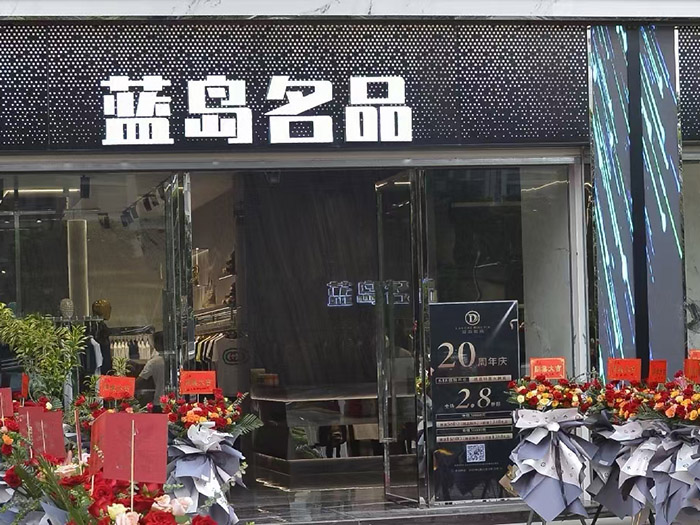 蓝岛名品位于福州市福清市元洪路诚丰世纪园10号楼105,门头采用无边发光字,LED彩屏,铝挡板穿孔亚克力底板发光,不锈钢背发光字,软膜灯箱,软膜天花。广告与装饰的结合擦出高档的火花。