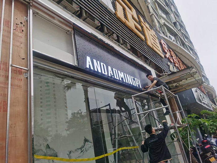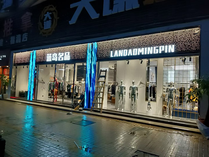蓝岛名品-福清广告网-福清名品网-福清生活网-福清服装店-福清户外广告-福清不锈钢背发光字-福清铝挡板穿孔亚克力底板发光-铝挡板-方管架