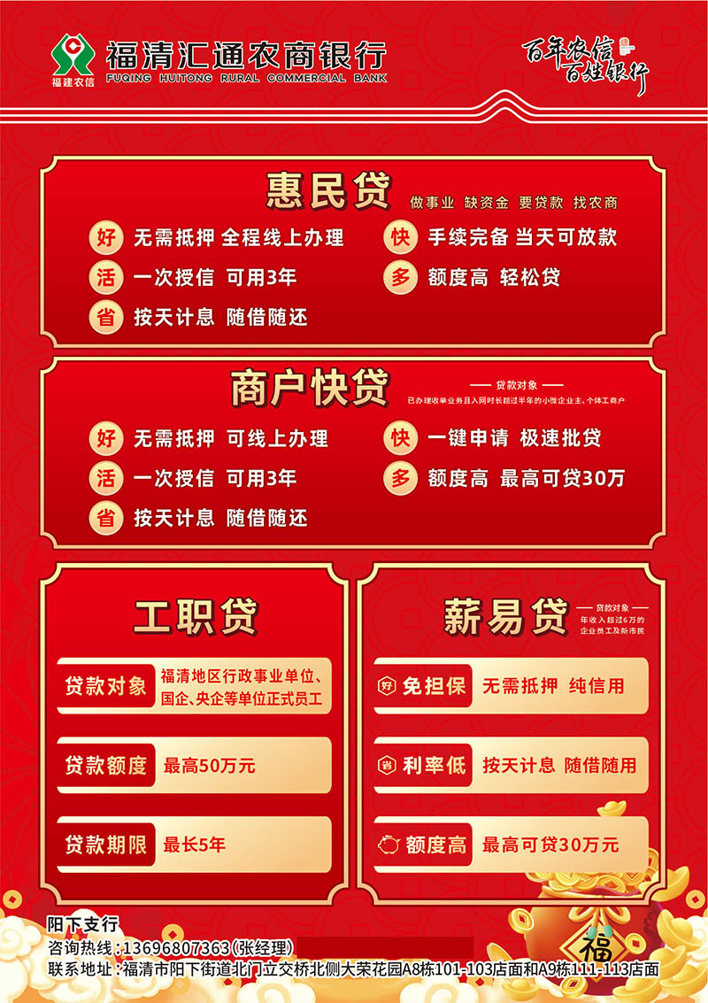 福清汇通农商银行,阳下支行,惠民贷,商户快贷,工职贷,薪易贷,住房抵押贷,装修贷,商户二维码收款