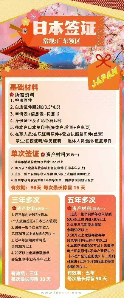 关键词:日本,日本签证,常规,广东领区,基础材料,护照,证件照,申请表,信息表,同意书,身份证,户口本,在职证明,营业执照,在校证明,学历证明,退休证,单次签证,三年多次,五年多次,银行流水,存款单,纳税,旅游,出入境,