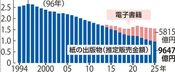 值得关注的是,日本纸质出版市场的下滑趋势已持续多年。自 1996 年达到峰值后,行业销售额便进入长期下行通道。即便在新冠疫情引发 “宅家需求” 的 2021 年左右,同比降幅曾短暂收窄,但后续仍再度扩大,此次跌破万亿日元关口更是凸显了传统出版业转型的紧迫性。