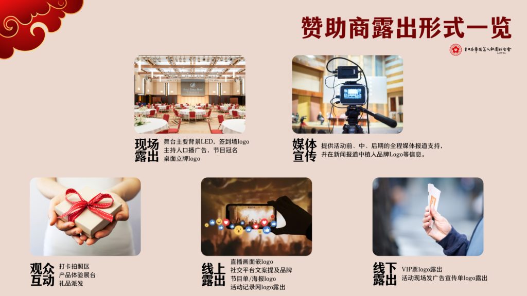 活动现场及节目单Logo露出、参会资格、品牌展示展位、社交媒体重点推介。